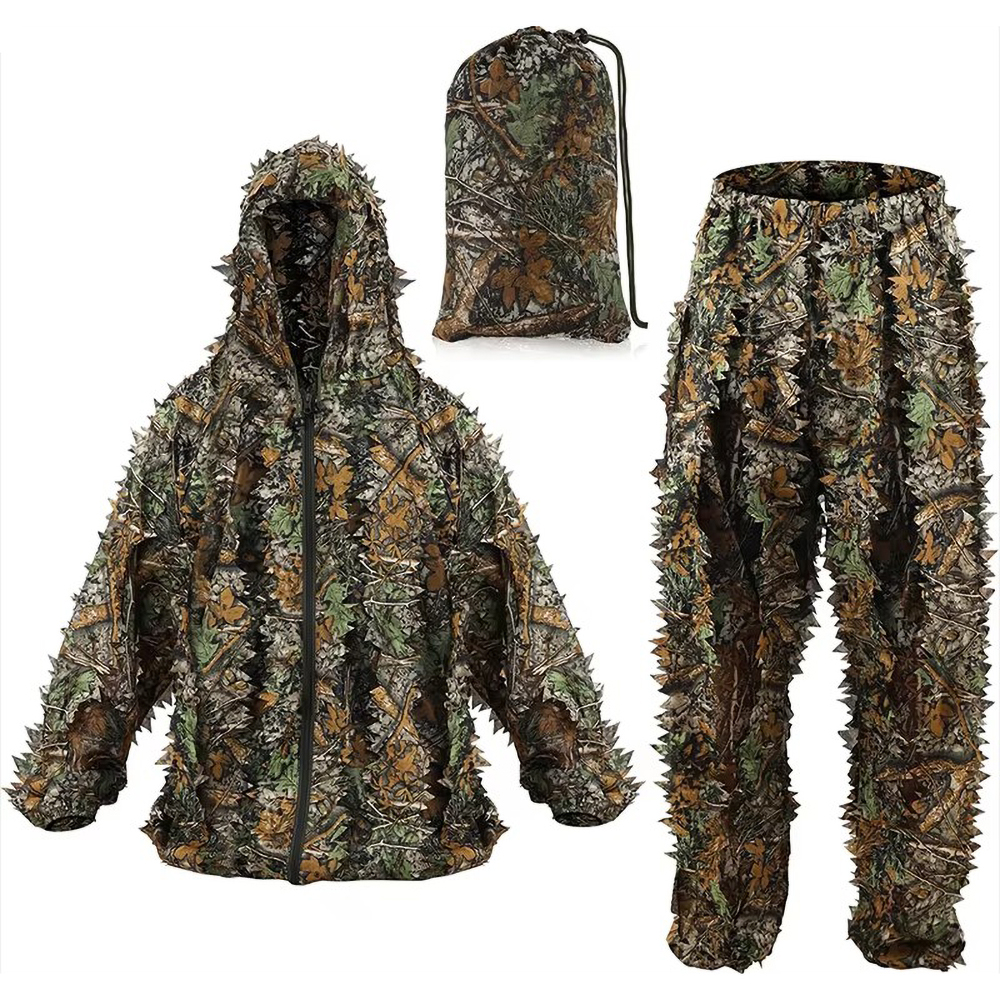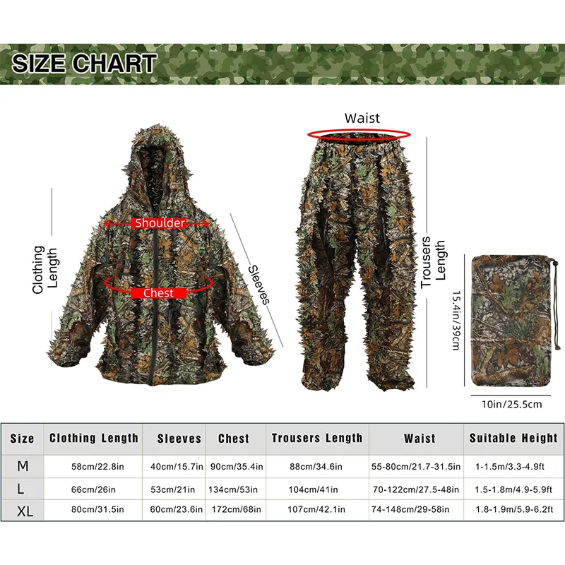 • Lightweight Practical 3D Leafy Camo Suits with Storage Bag Ghillie Suits for Men Leaf Camouflage Training Hunting Ghillie Suit Jungle Hunting Camo Ghillie Suit 3D Leaf with Zippers and Pockets Lightweight Breathable Outdoor Hunting Camouflage Clothing